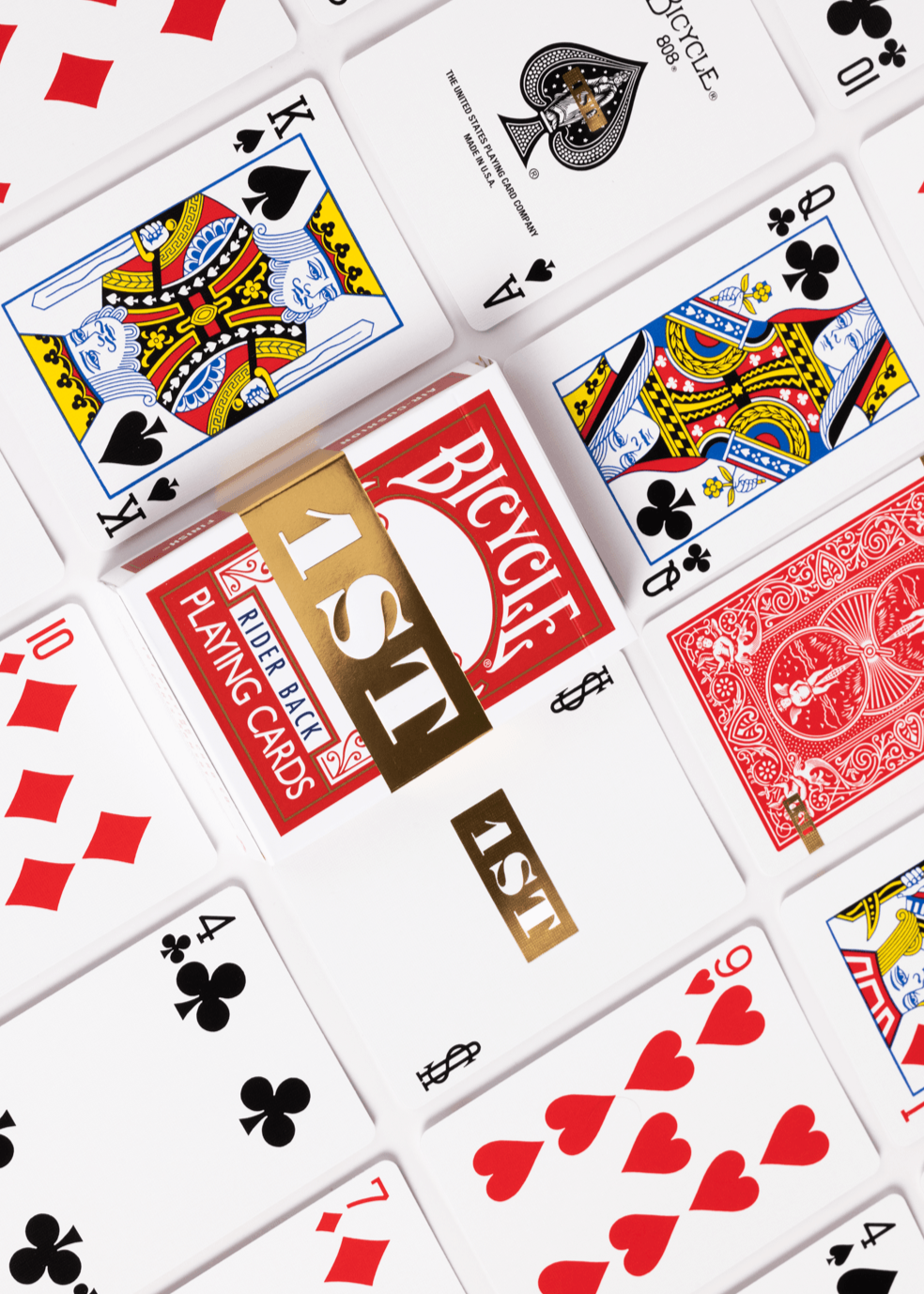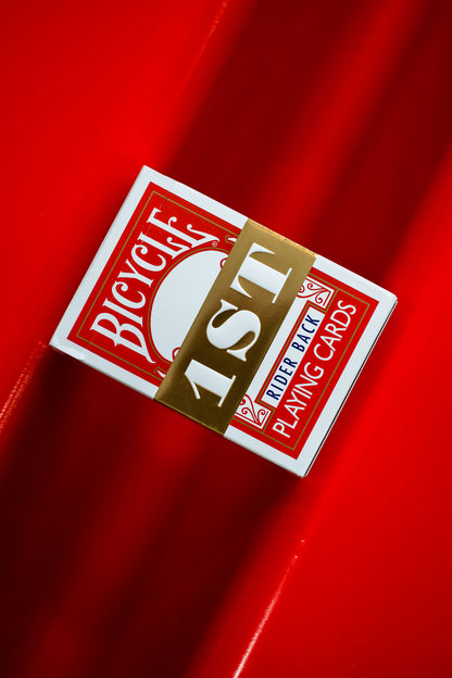 A prestigious collaboration on an iconic deck. A Bicycle Rider Back collaboration with Chris Ramsay and 1ST is available in black, red and blue. Featuring a custom tuck case, a custom 1ST Joker, a blank card, and extra 4 of Spades, this elegant collaboration is a must-have.