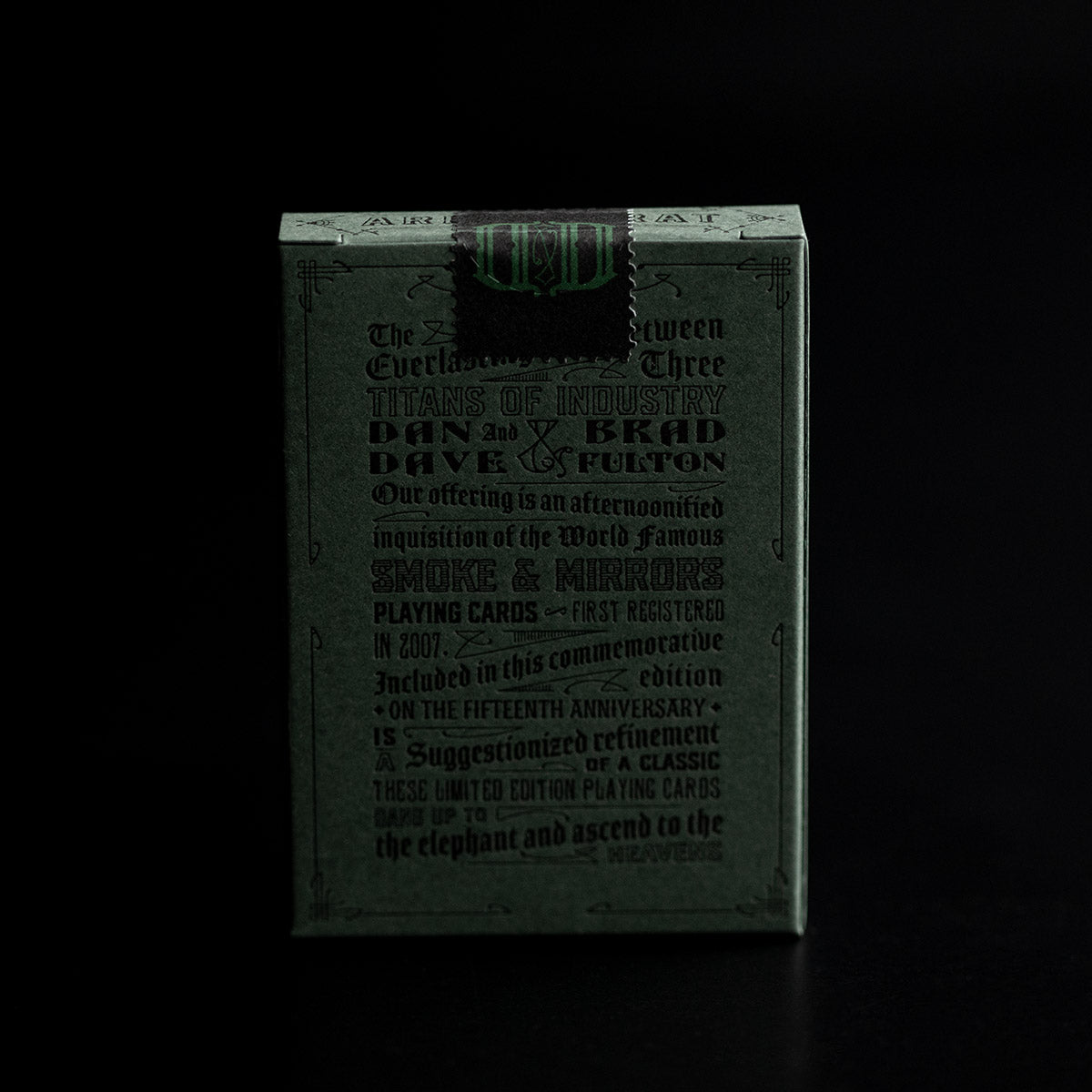 This new fifteen-anniversary edition in green takes inspiration from 19th-century typography, a homage to the original Smoke & Mirrors design with intricate details for a sophisticated look.