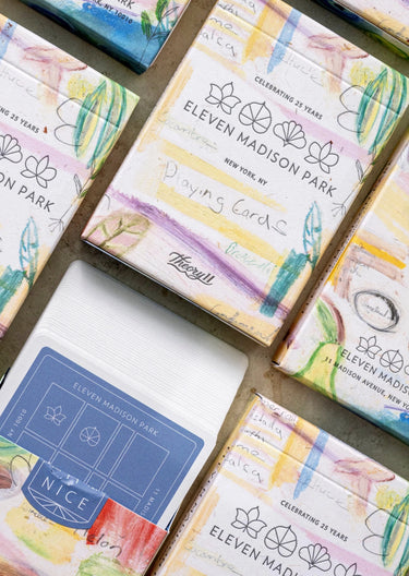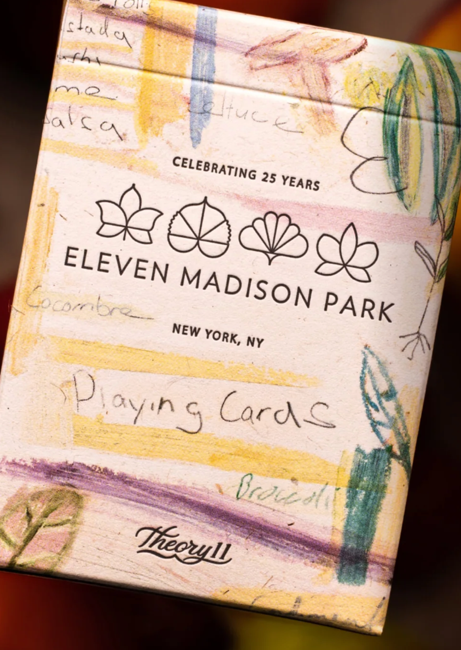 To commemorate the 25th anniversary of Eleven Madison Park, theory11 produced a deck of premium playing cards, with original art composed of watercolor illustrations by Daniel Humm. The playing card packaging utilizes FSC-certified sustainable hemp paper, with letterpress printing handcrafted in Minnesota.
